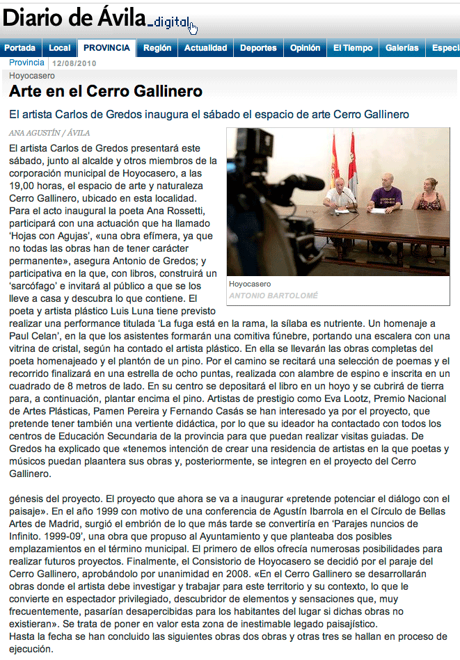 [12/08/2010] DIARIO DE ÁVILA_digital. Arte en el Cerro Gallinero: El artista Carlos de Gredos inaugura el sábado el espacio de arte Cerro Gallinero. >>Ver>>Fuente