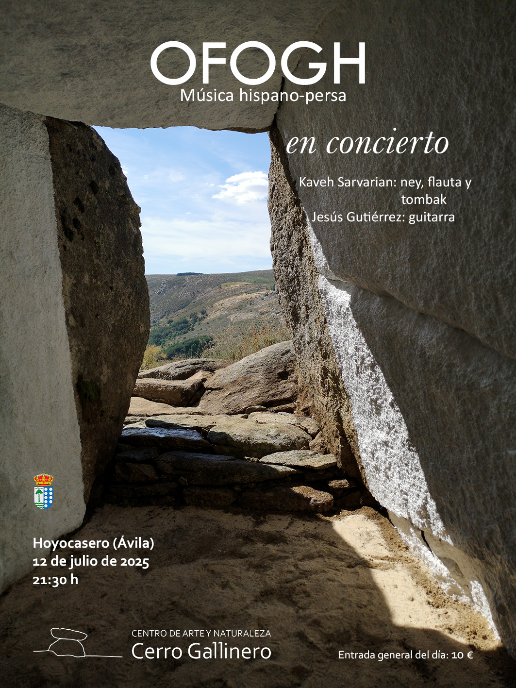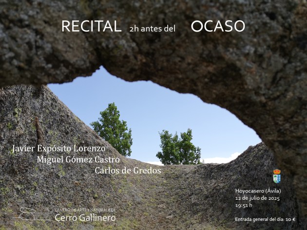 El Centro de Arte y Naturaleza Cerro Gallinero convoca a un nuevo “RECITAL 2 h antes del OCASO” que dará comienzo a las 19:51 del día 12 de julio y tendrá lugar junto al Laberinto. Contará con los poemas de Javier Expósito Lorenzo, Miguel Gómez Castro y Carlos de Gredos. A continuación, sobre las 21:30 h empezará el concierto de Ofogh.