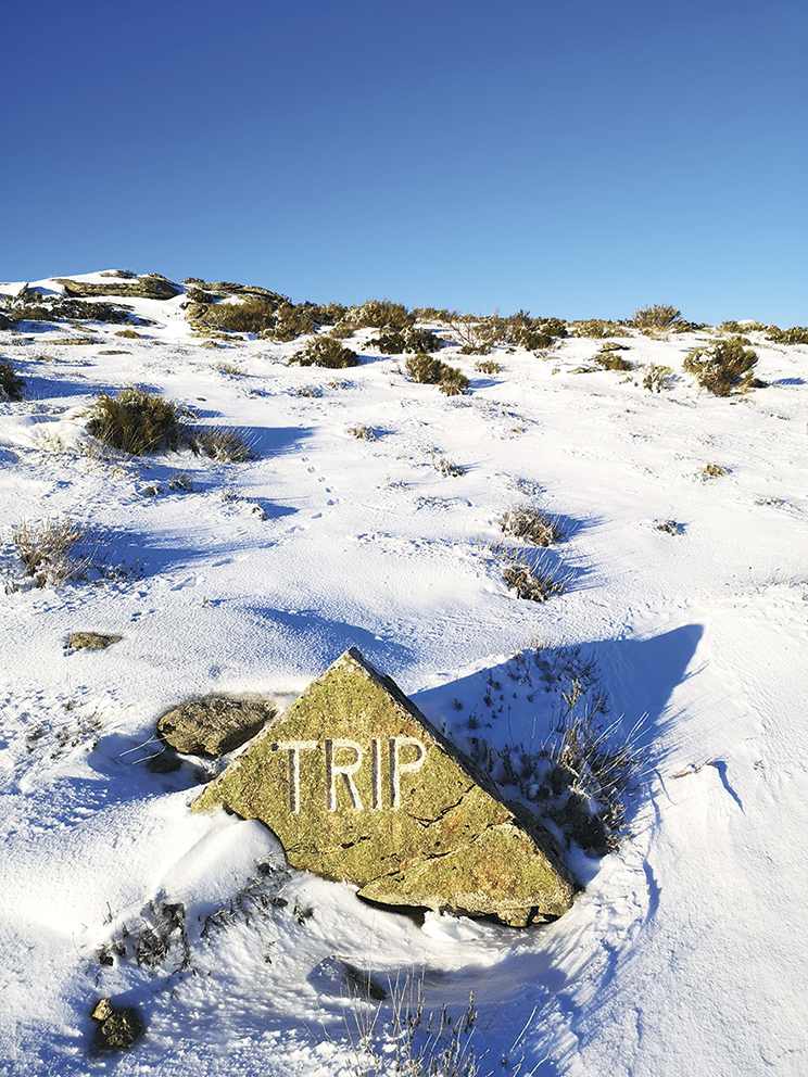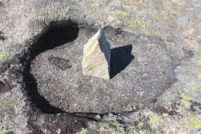 Esta piedra natural, triangular y con un ángulo de 90º, parece formar parte de un cementerio civil. La palabra inglesa TRIP, viaje, tropiezo, está al sur. Desde el norte, desde la sombra, leemos RIP, Requiescat in pace (descanse en paz en latín).