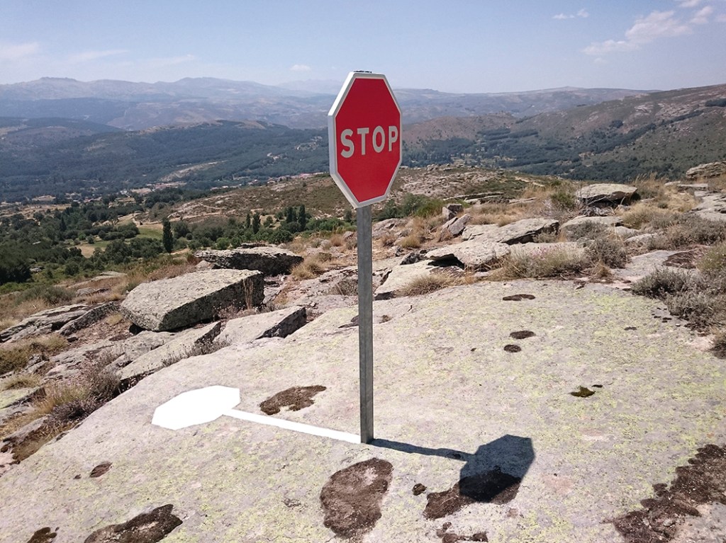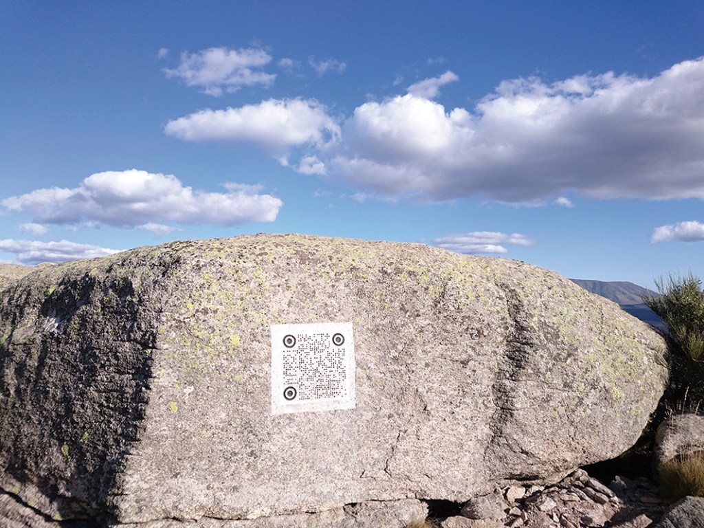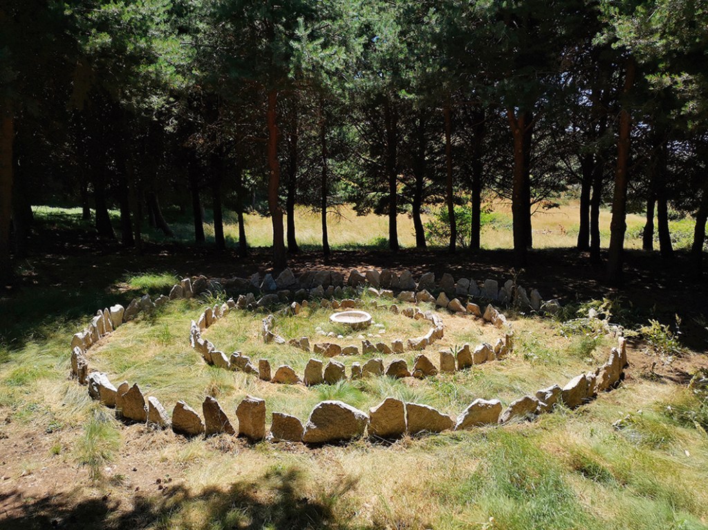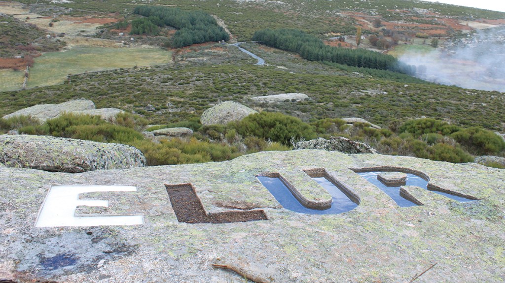 The word silence is carved into the ground and one of its anagrams, without sky, on its vertical axis, on the ledge of one of the rocks on the west peak, where silence, solitude, inspiration and intuition arrive more clearly.