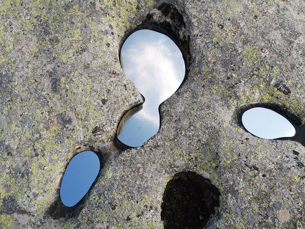 «The chosen shapes are reminiscent of embryos, eggs, nests: the rebirth». They are stainless steel mirrors housed in basins. «Earth-rock meets sky-mirror. The water will cover them in winter and the sun will make them shine in summer».
