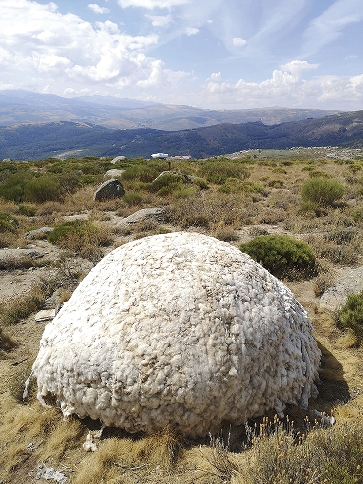 Con lana de oveja está forrada la roca. Es como si estuvieran representadas todas las ovejas que han pastoreado en el Cerro. Su obra nos habla de ello y también de esa protección necesaria en estas tierras duras en invierno.