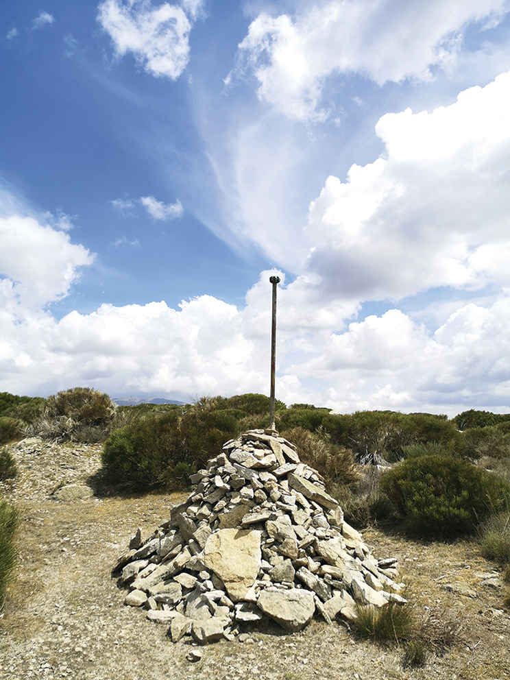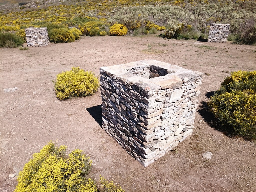 It dimensions the human in relation to the natural. It consists of three cubes of 1 meter of each side built with slabs of the place and open to wait for life to nest, forming the three, with one of its sides, the figure of an equilateral triangle.