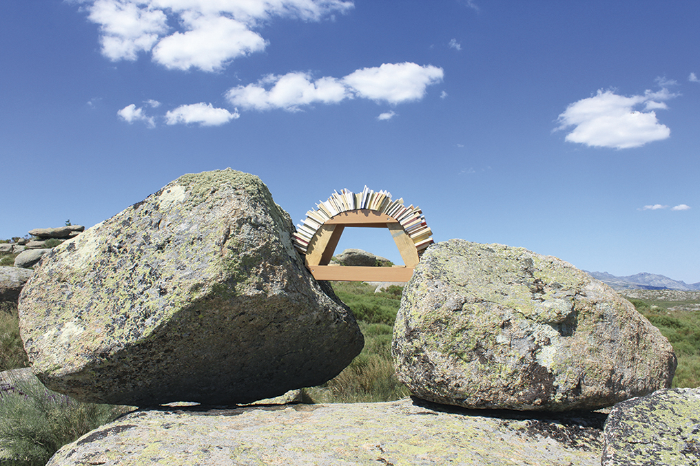 Una cimbra es un armazón que sostiene el peso de un arco o de otra construcción mientras se está construyendo. La obra consta de dos partes, la que no se ve, la formada por libros y su transmutación en lajas.