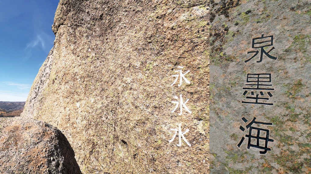 They are two poems written in Japanese, one based on the writing and the other on its sonority, with semantic logic. One reads: eternity, ice, water and the other: fountain, ink, sea. The common denominator of all is water added to eternity.