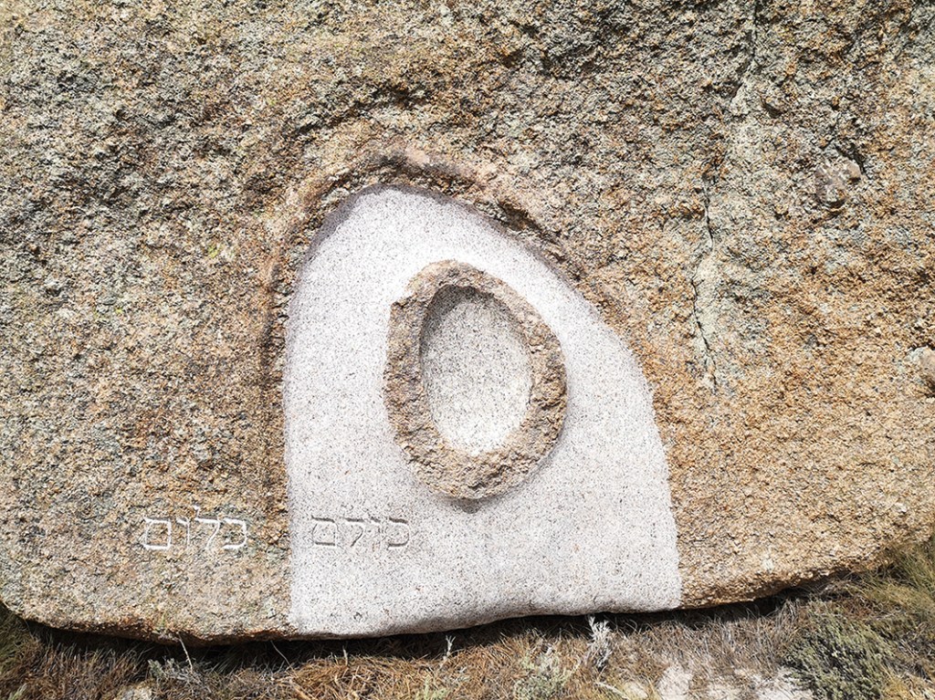 Natural graphy like a finger as if emerging from the bowels of the earth. It contains the Hebrew poem «כלום» /klum/, nothing and «כולם» /kulam/, everything. Nothing is equal to everything. The essential truth is that we are all ONE.