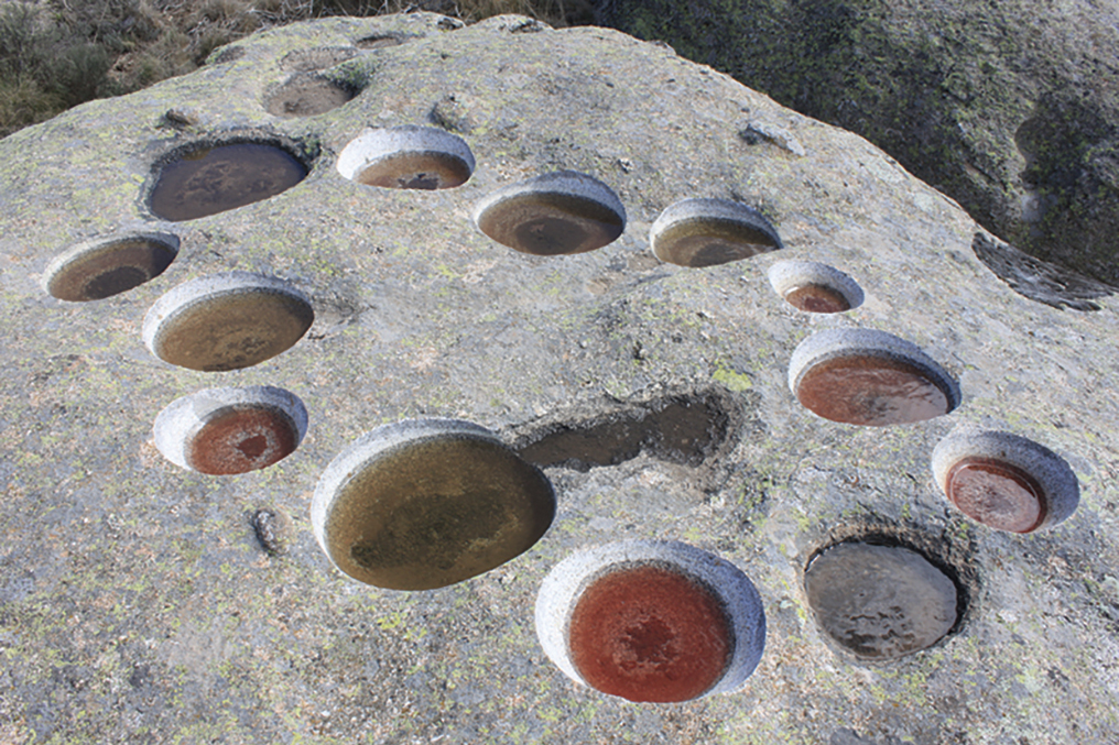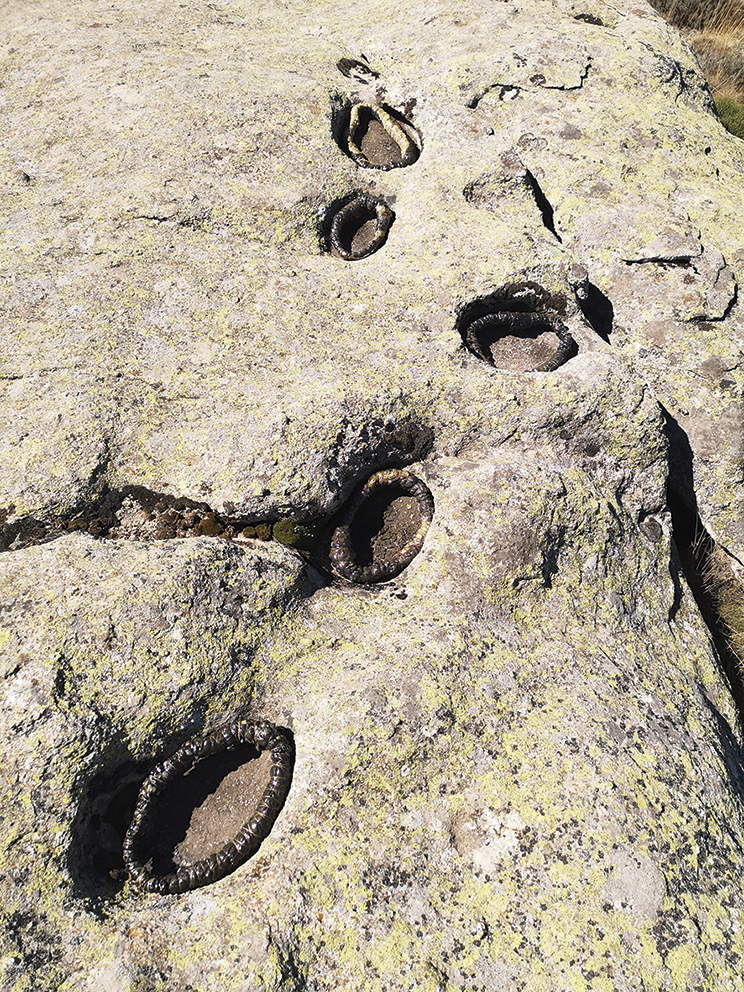 Las concavidades naturales producto de la erosión sobre la superficie de esta roca, por la acción del agua y el hielo, han sido aprovechadas por el artista para crear un collar de carácter simbólico añadiendo las cuentas que faltaban.