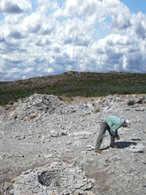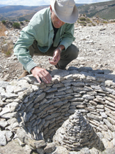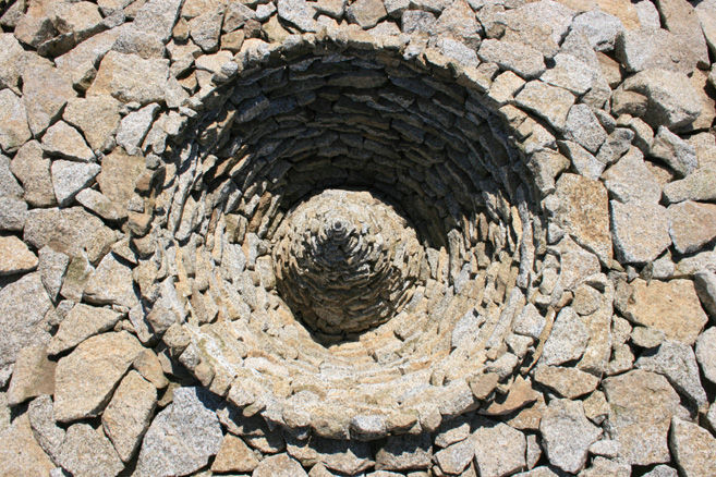 Esta es la maqueta, que se puede contemplar in situ, de una obra que tendrá un diámetro de 960 cm cuando esté terminada. La lajas de granito proceden de los restos de una cantera en superficie, actualmente en desuso, que se encuentra en el Cerro Gallinero. Las piezas que forman estos dos conos, uno invertido respecto del otro, se mantienen unidas en perfecto equilibrio sin que exista ningún material aglomerante entre ellas.