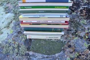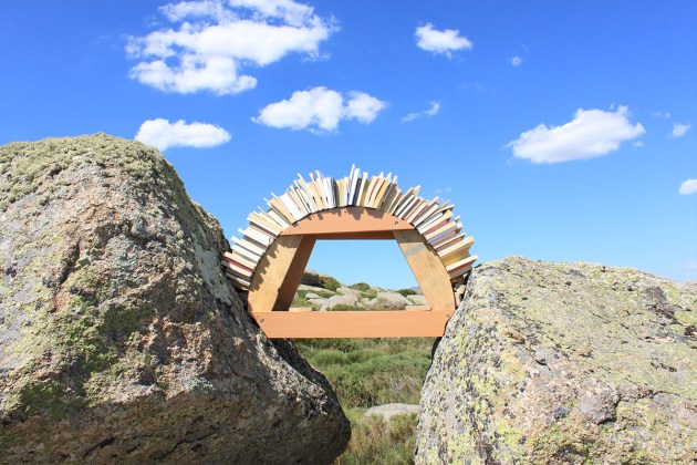 Una cimbra es un armazón que sostiene el peso de un arco o de otra construcción, destinada a salvar un vano, en tanto no está en condiciones de sostenerse por sí misma. Esto es lo que nos dice la RAE. La obra consta de dos partes, una que el público solamente verá en la web del Centro y es la realizada con libros, que después de retirar la cimbra difícilmente se sostendrían, es decir, el tránsito de una roca a la otra es precario. Lo que se ve es la transmutación de los libros en lajas, que curiosamente tampoco se sostenían con cierta seguridad debido a su escasa dimensión, por lo que hubo que recibirlas con argamasa. Que para el mismo arco se encontrase la misma dificultad, nos hace pensar que el mérito recae en la cimbra, es decir, en el valor del intermediario… necesario.