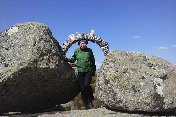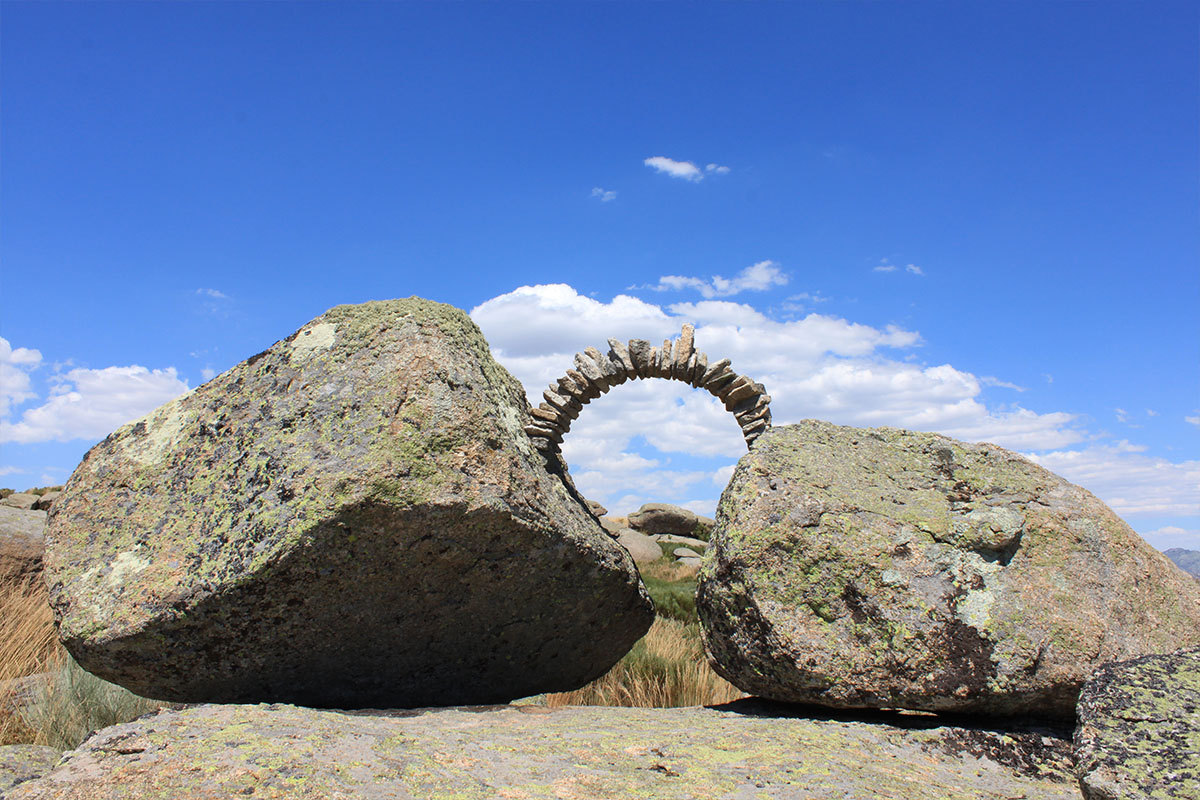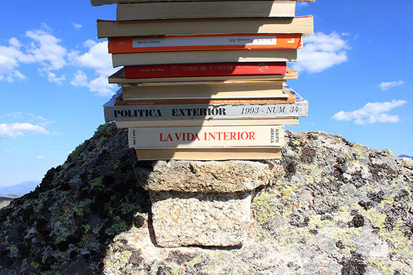Una cimbra es un armazón que sostiene el peso de un arco o de otra construcción, destinada a salvar un vano, en tanto no está en condiciones de sostenerse por sí misma. Esto es lo que nos dice la RAE. La obra consta de dos partes, una que el público solamente verá en la web del Centro y es la realizada con libros, que después de retirar la cimbra difícilmente se sostendrían, es decir, el tránsito de una roca a la otra es precario. Lo que se ve es la transmutación de los libros en lajas, que curiosamente tampoco se sostenían con cierta seguridad debido a su escasa dimensión, por lo que hubo que recibirlas con argamasa. Que para el mismo arco se encontrase la misma dificultad, nos hace pensar que el mérito recae en la cimbra, es decir, en el valor del intermediario… necesario.