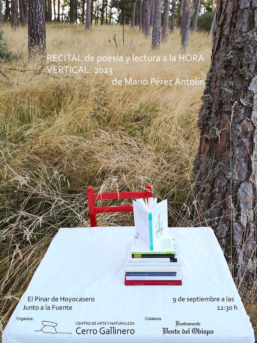 La Inauguración de la 14ª Temporada arranca en el Pinar de Hoyocasero, donde tendrá lugar el “Recital de poesía y lectura a la hora vertical”, correrá a cargo de Mario Pérez Antolín, con quien tendremos después un coloquio. El lugar exacto está al lado de la fuente que se ve desde el camino. El acto dará comienzo a las 12:30 h. Recomendamos dejar el coche a la entrada que está en el km 4 de la AV-905 y pasear un kilómetro y medio por este bosque, declarado Reserva Natural.